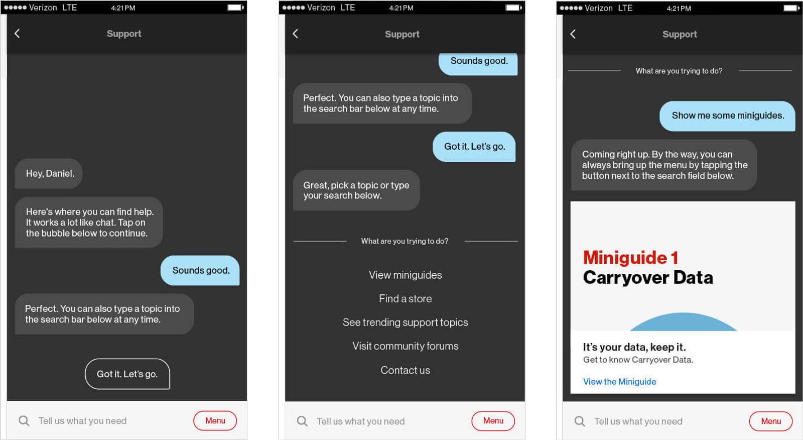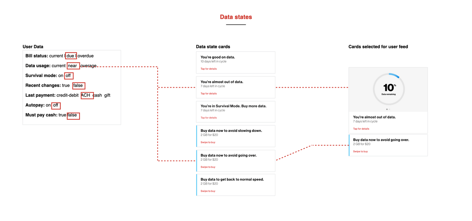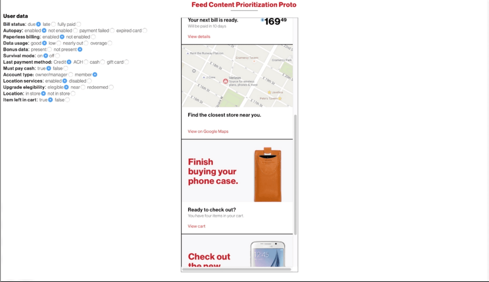 The redesigned app was intended as the primary point of contact for Verizon customers: Verizon wanted to enable its customers to self-serve as much as possible. To this end, we developed a dynamic, card-based feed to greet users with the most relevant information about their account, as well as things they might not know to help them get the most out out of their service. The feed would display different messages in a different order depending on a given user's account status; for this, I wrote the business rules and logic.